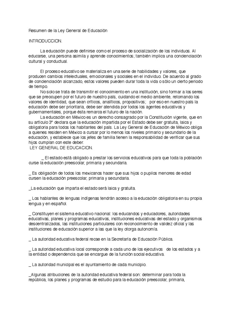Ley General De Educación Resumen : Articulo 33 Dela Ley General De Educacion - Ley Compartir / Una forma fácil y práctica de comprender las leyes.. Capitulo i disposiciones generales artículo 1. Todos los habitantes del país deben cursar la educación preescolar, la primaria y la secundaria es obligación de los mexicanos hacer que sus hijas, hijos o pupilos menores de edad. Se entiende por educación formal aquella que se imparte en establecimientos educativos aprobados, en una secuencia regular de ciclos lectivos, con sujeción a pautas curriculares progresivas, y conducente a grados y títulos. Ley general de educación ley nro. La atención de estos otros factores está prevista en la ley general de educación y en otros programas y ordenamientos.
